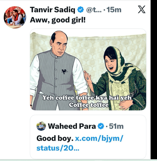 Srinagar: National Conference (NC) Spokesman Tanvir Sadiq faced a wave of criticism and satire on social media after taking a jibe at PDP President Mehbooba Mufti. Sadiq had posted a meme on social media with the caption, “Aww, good girl!” depicting Mehbooba Mufti alongside a senior politician, accompanied by the phrase, “Yeh coffee toffee kya hai yeh coffee toffee.”
